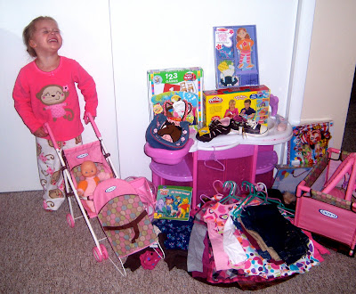 Here is the birthday girl after her party showing off all of her new toys and clothes!! She is one spoiled little girl.
