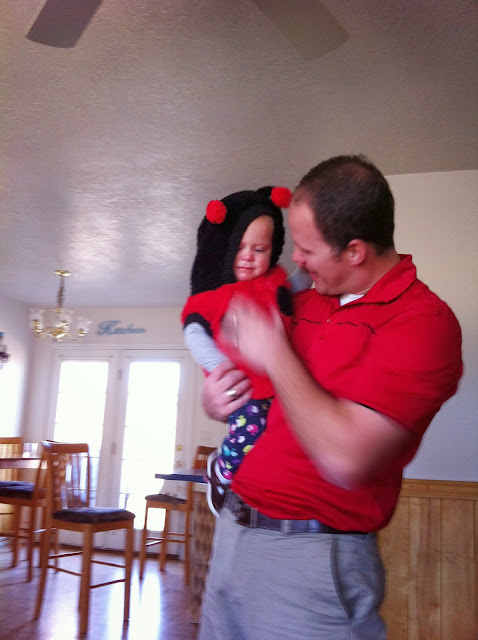 My husband trying to calm Avie down! She did not want to be in that ladybug costume!
