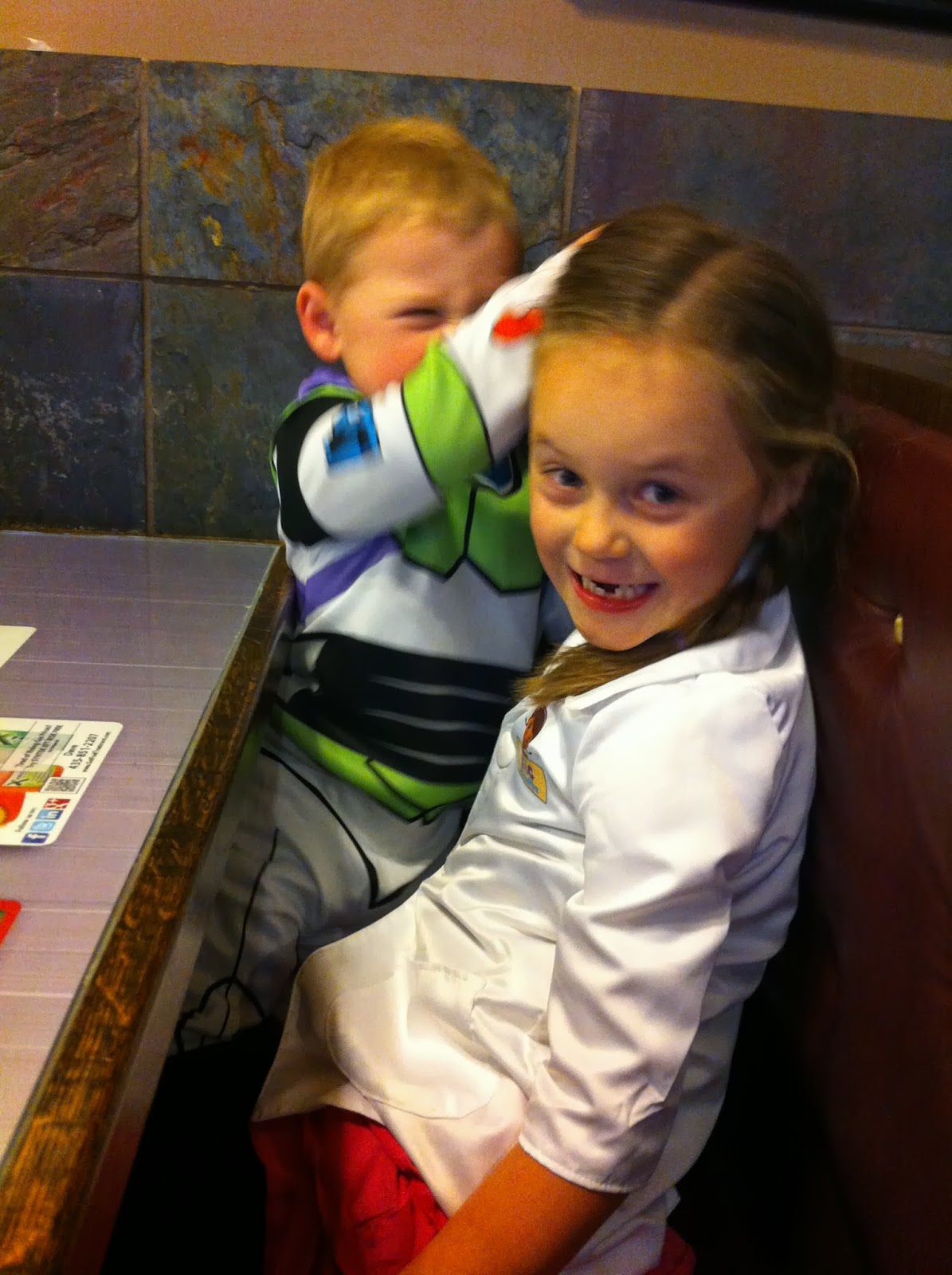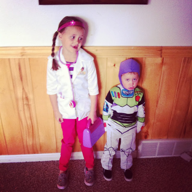 Hannah was Doc Mcstuffins this year and Charlie was Buzz lightyear! Charlie doesn't look thrilled in this picture, but I promise he was.