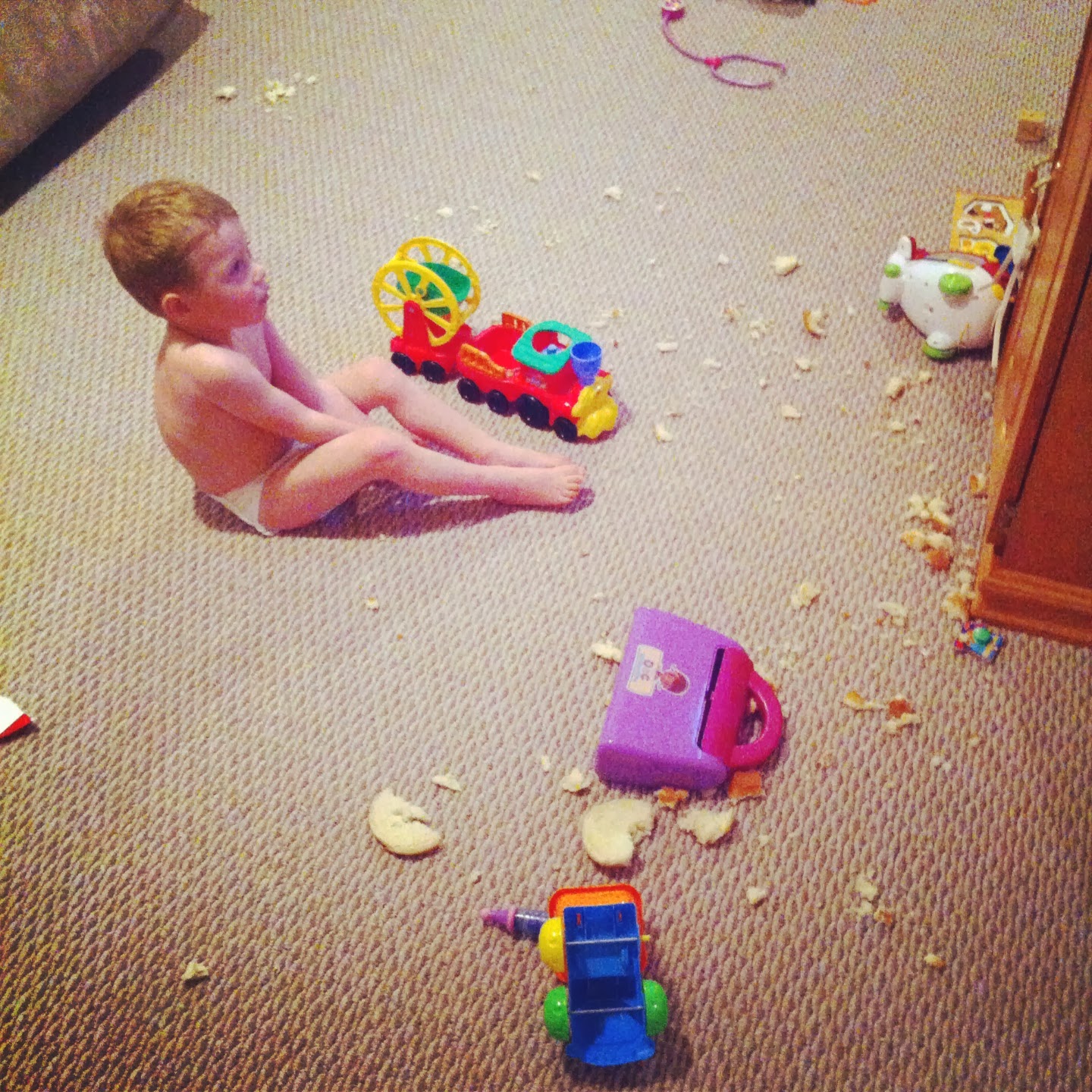 You know that moment when you realize your kid has been way too quiet for way too long?  Well that's what happened when I thought Charlie was being such a good boy and watching a movie! I was dead wrong.  I go downstairs and he destroyed a half a bag of hamburger buns and scattered bread all over our downstairs.  It was great.