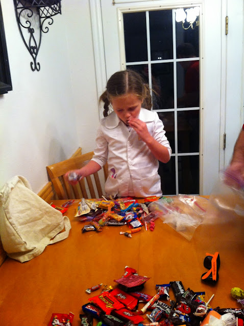 Hannah checking out her stash.  She chose to eat a Milky Way for her one piece of candy last night. I personally would have went for the Kit Kat.  Oh wait, I did do that. ;)